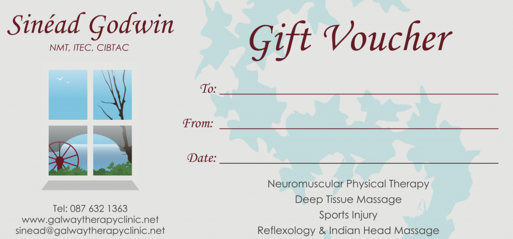 Gift Vouchers Gift Vouchers Looking for a meaningful present? Our gift vouchers offer friends and family the perfect gift of wellbeing. Galway Therapy Clinic Can’t think what to buy for a dear friend? Why not give them a Massage Gift Voucher and show them you care. Gift Vouchers available for all therapies.Please contact me by text if you would like me to send you a voucher. Please then pay via the link below. Pay here